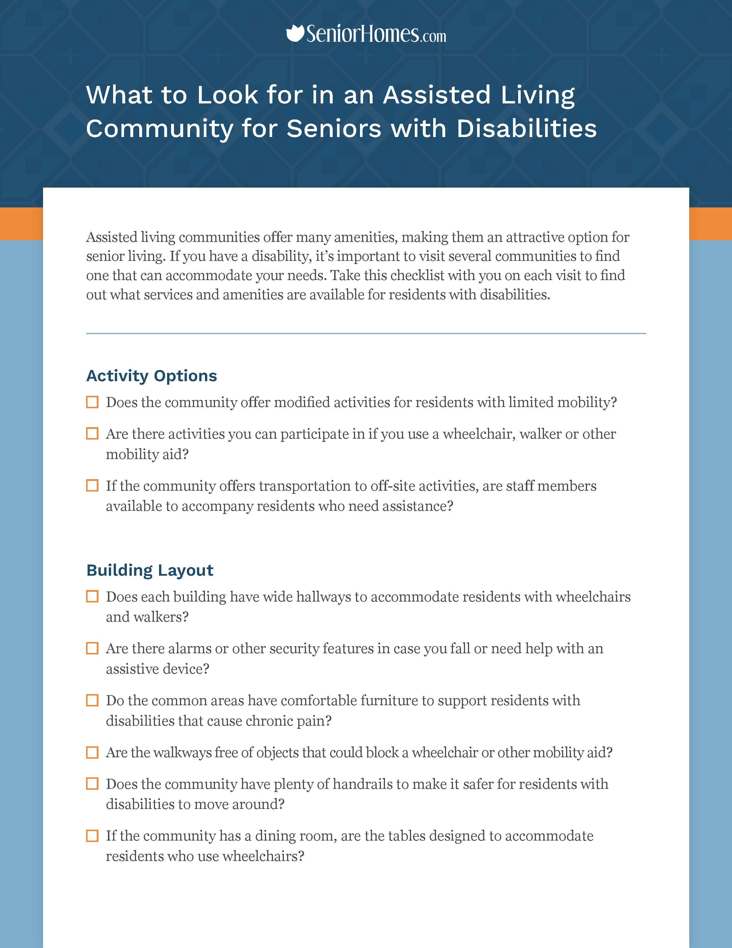 We created this resource for seniors with disabilities who may want or need to move to an assisted living facility to help them and their families make informed decisions. We provide an overview of common disabilities impacting seniors, discussing the benefits of assisted living, the care provided and how to choose the ideal facility to meet a disabled senior’s current needs.