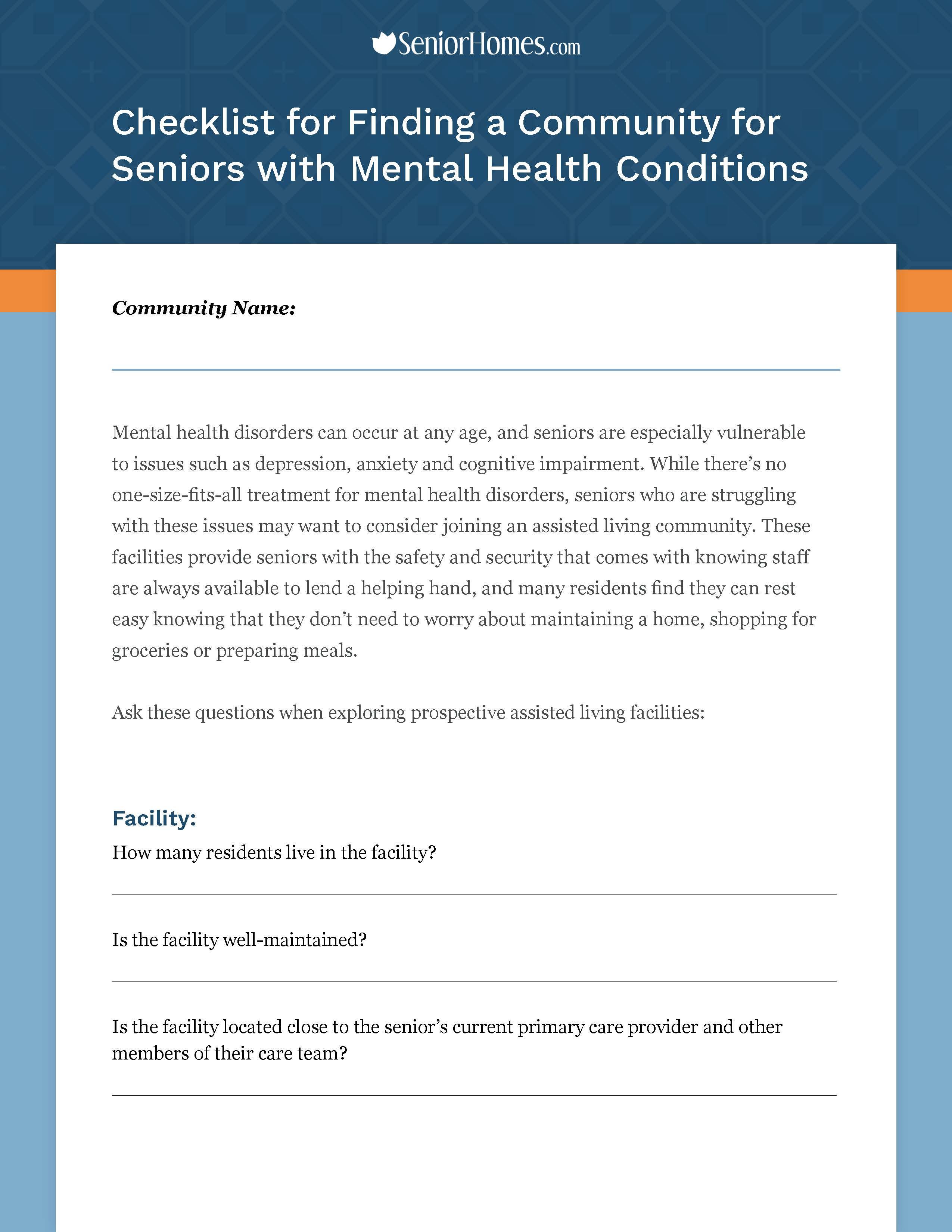 Click the button below to download your Check List for Assisted Living Communities for Seniors with Mental Health Disorders.